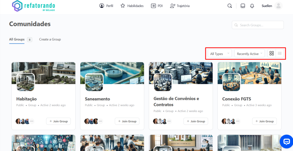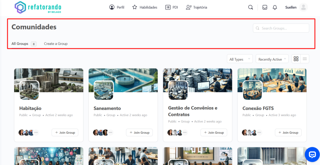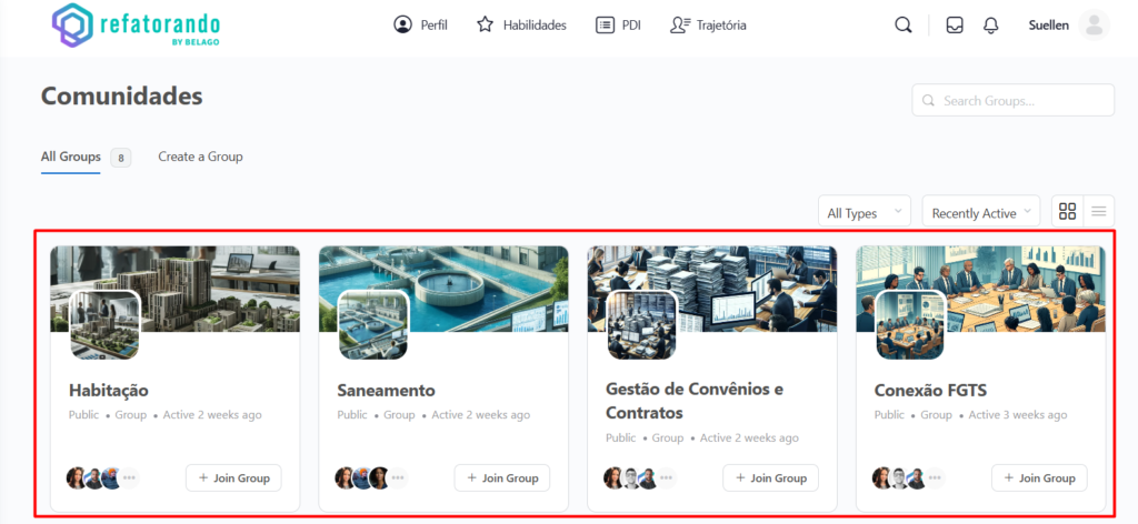 ✅Entrar em uma comunidade: Clicando no botão “+ Join Group”, o usuário pode participar da comunidade.