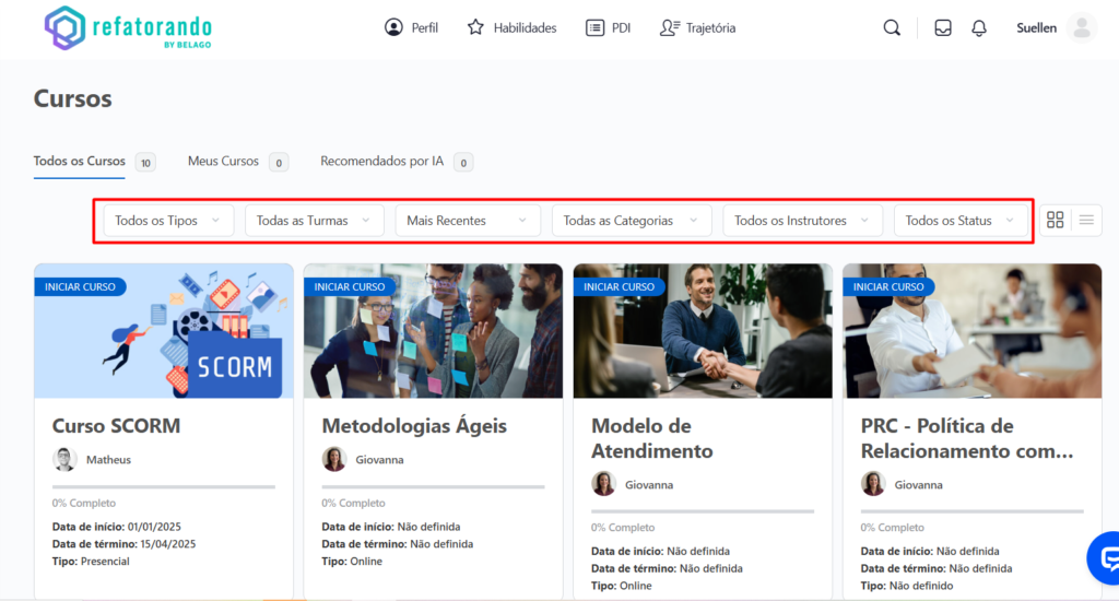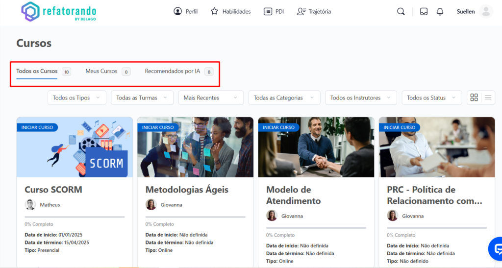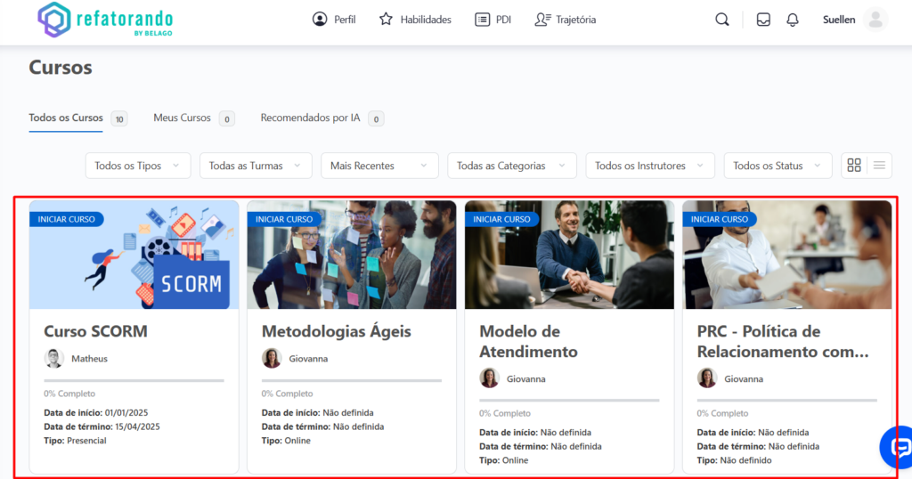 A tela de Cursos da Refatorando foi projetada para oferecer uma experiência personalizada, eficiente e dinâmica, ajudando você a evoluir continuamente em sua jornada de aprendizado. 🚀