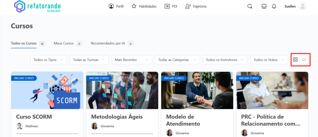 Para facilitar a navegação e a organização dos cursos, a tela de Cursos da Refatorando oferece dois modos de visualização: