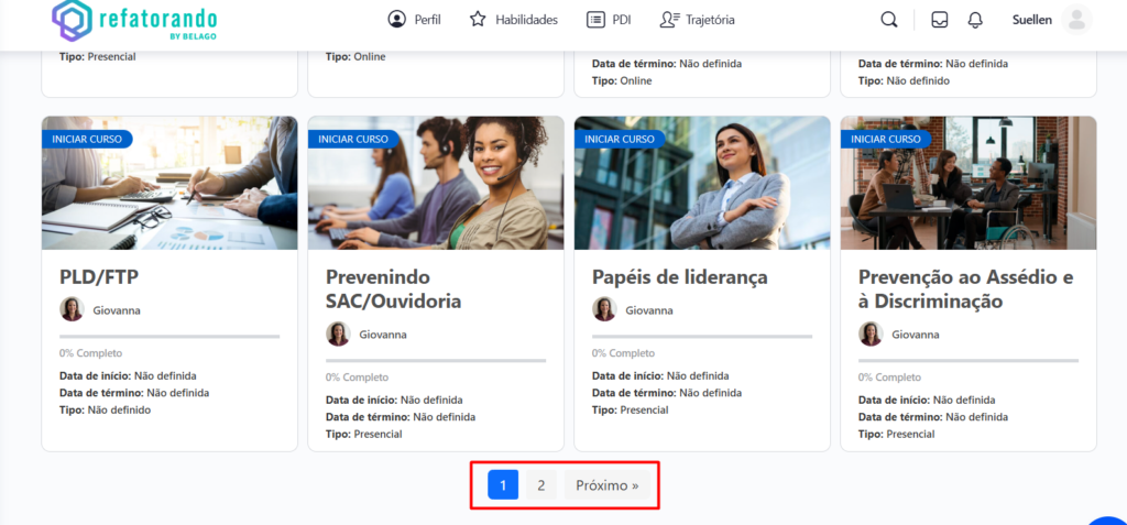 Para facilitar a exploração dos cursos disponíveis, a tela de Cursos da Refatorando conta com botões de navegação entre páginas, garantindo que o usuário possa percorrer a lista de cursos de forma organizada e eficiente. Para melhor visualização, são limitadas a grade de visualização a 8 cursos por página.