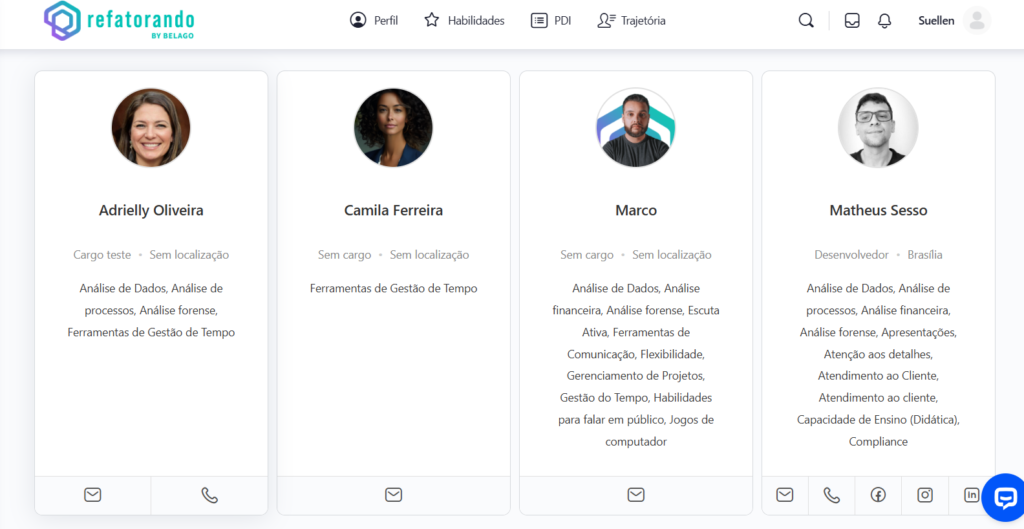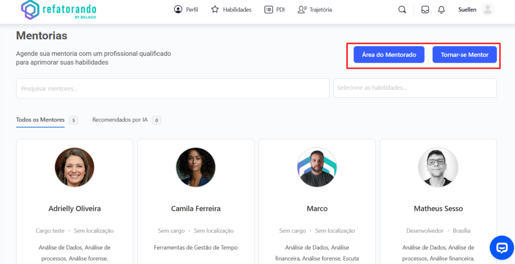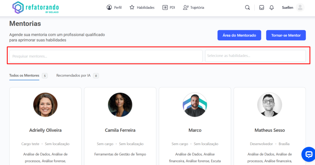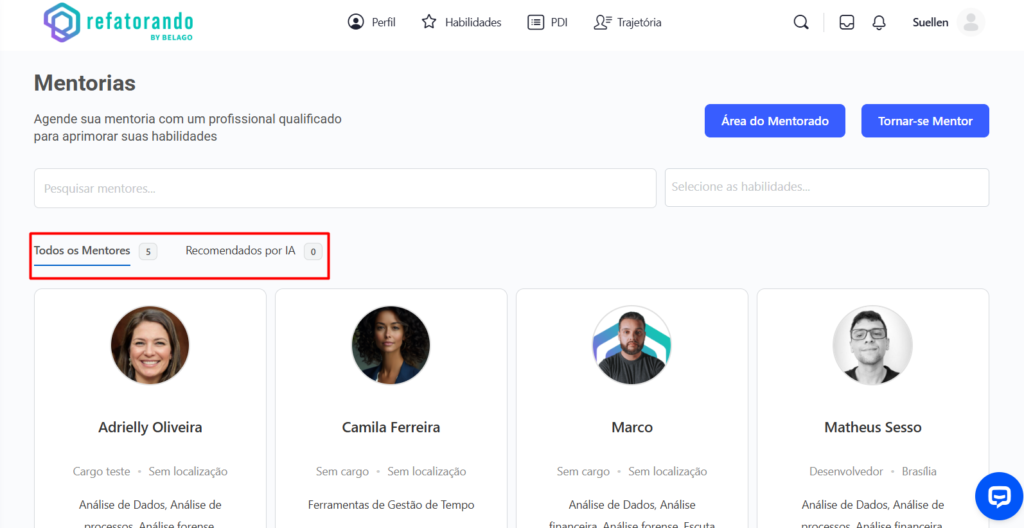 • Recomendados por IA: Sugere mentores com base nas habilidades do usuário.