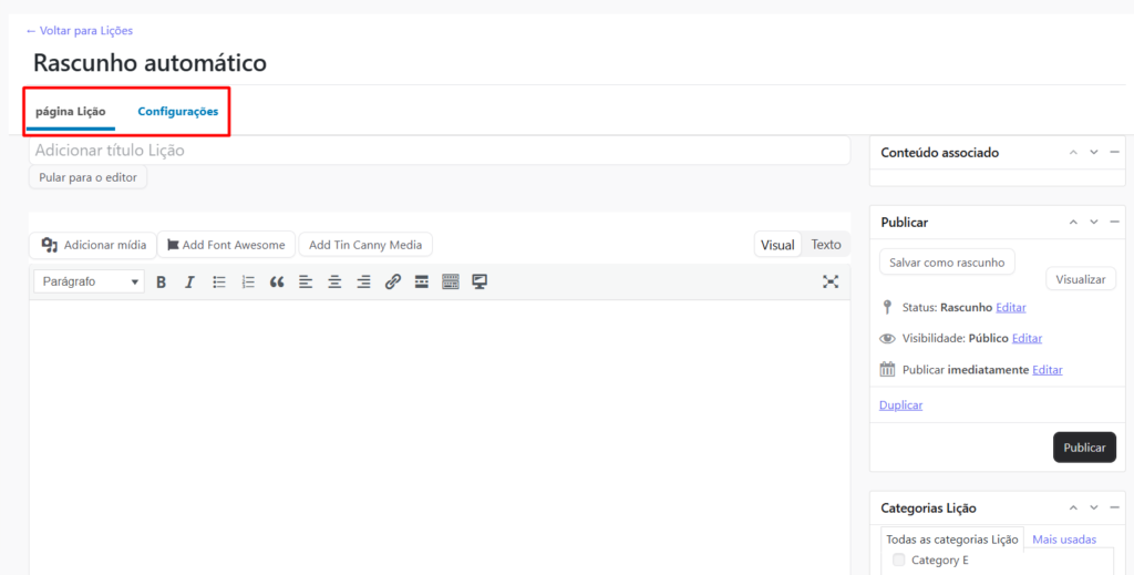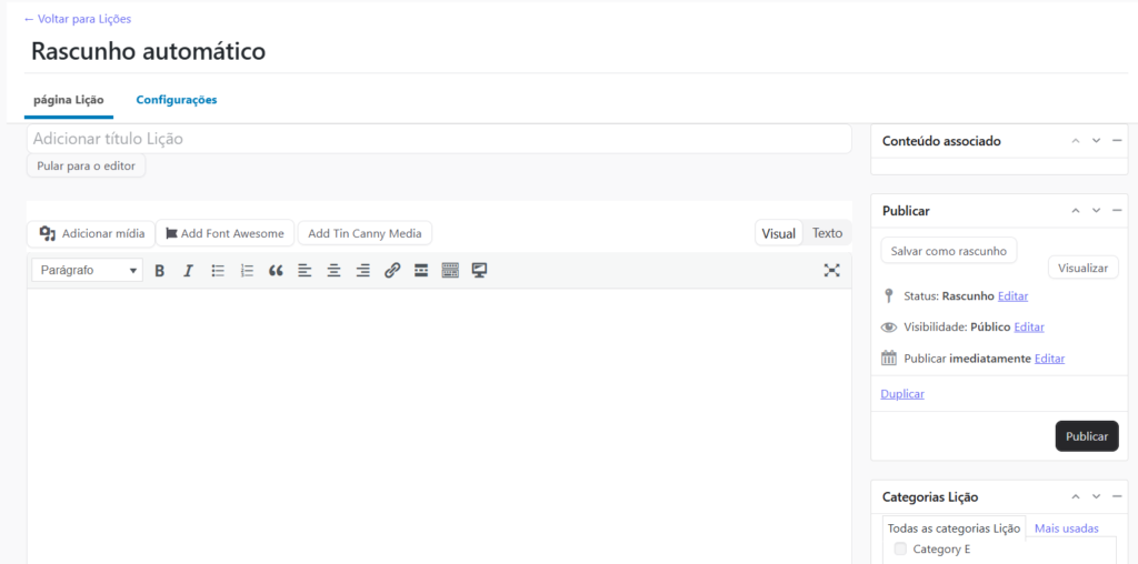 Nesta tela o usuário pode criar e editar lições dentro de um curso, formatando o conteúdo, adicionando mídias e configurando a visibilidade antes de publicá-lo para os alunos. A interface é organizada em diferentes seções que facilitam a criação de materiais educacionais de forma intuitiva, permitindo que o usuário controle todos os aspectos da lição de maneira eficiente.