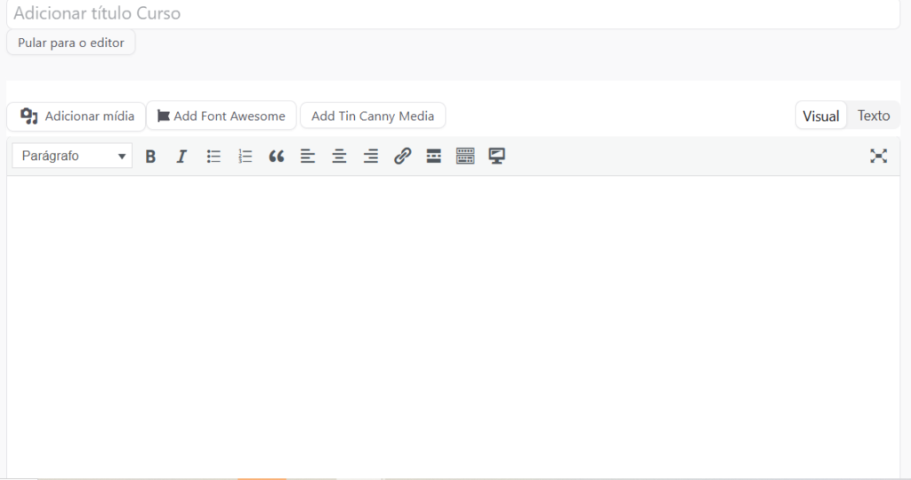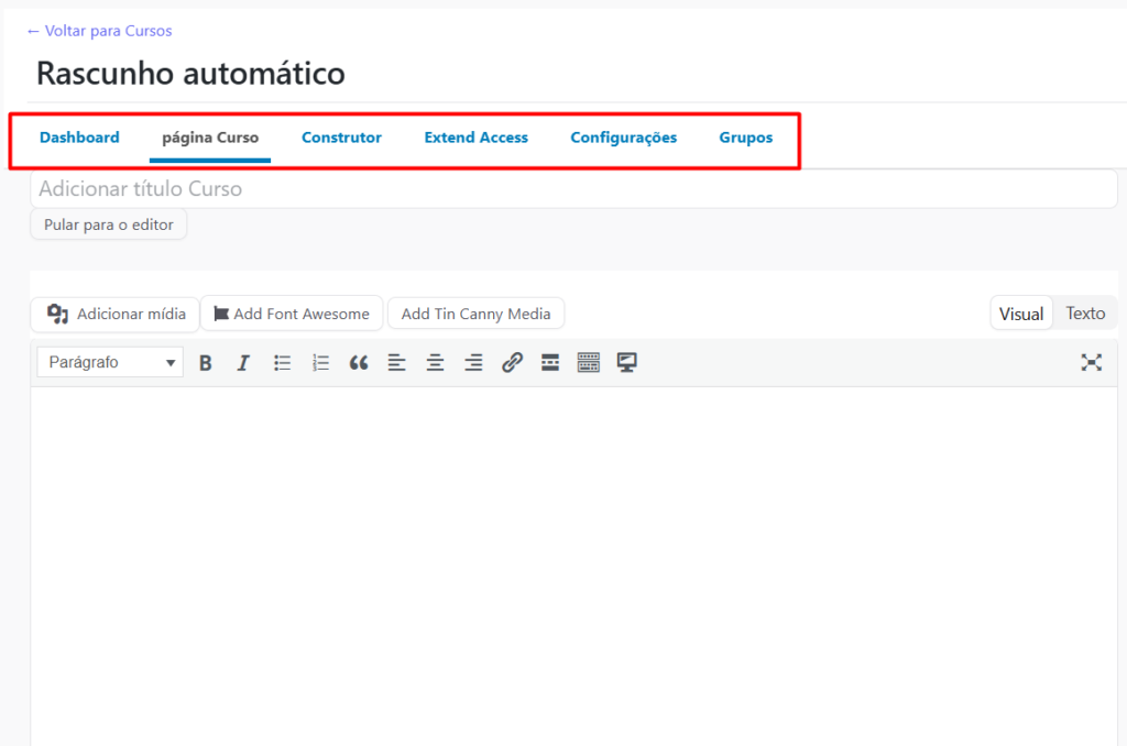 O usuário pode adicionar um título, inserir e formatar conteúdos (texto, imagens, vídeos) e configurar categorias. Além disso, há opções para definir a visibilidade do curso, salvar como rascunho ou publicá-lo imediatamente. O painel lateral fornece controle rápido sobre o status da publicação, enquanto o menu superior oferece acesso a recursos avançados, como configuração de acesso e organização de módulos. De forma geral, esta é a principal interface para estruturar cursos na plataforma, garantindo personalização e gerenciamento completo do conteúdo educacional.