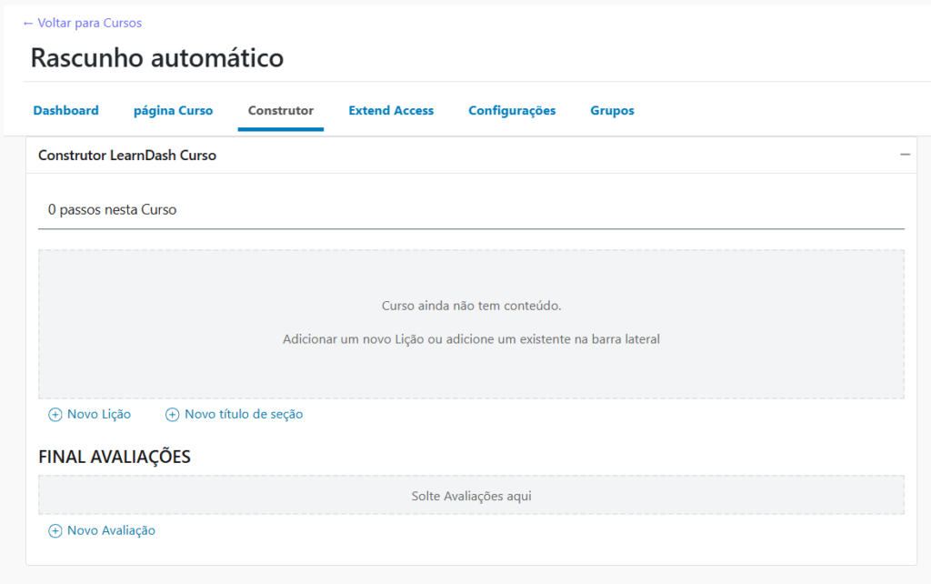 A tela do construtor é onde colocamos as lições e avaliações do curso:- Lições: Pode tanto criar uma lição nova do zero, clicando em “Nova Lição“, quanto pode selecionar uma lição já pronta no menu lateral, basta clicar em “Adicionar“.