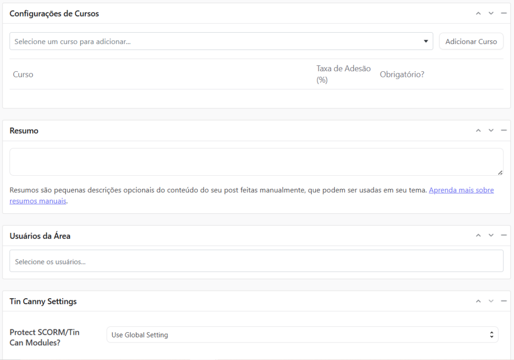 ✅ Cursos Vinculados – Relacionar a área com cursos e definir regras.