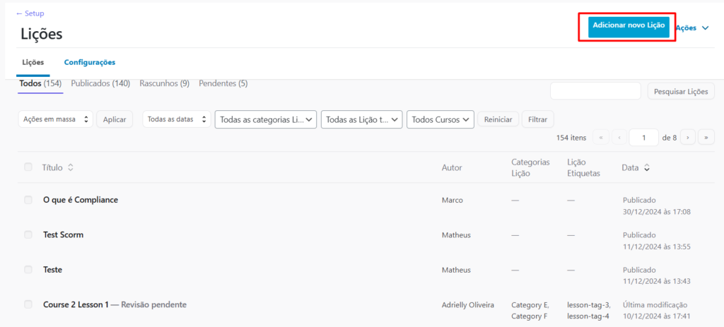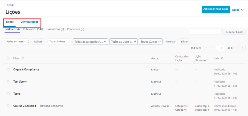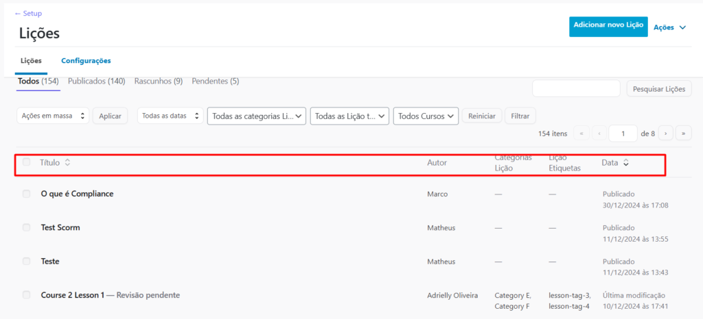 - Abaixo dos filtros, há uma tabela com as informações das lições. Os principais campos são: Título, Autor, Categorias da lição, Etiquetas da Lição e Data.