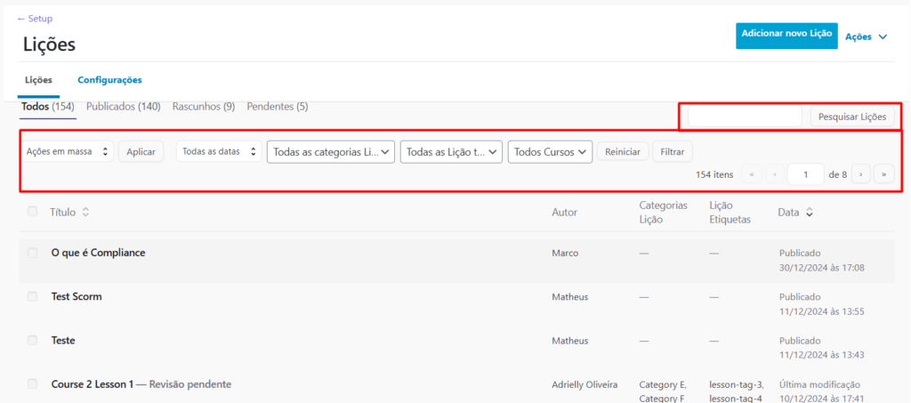 - Filtros de pesquisa e categorização: Opções para filtrar cursos por data, Categoria da lição, Tipo da lição e Curso ao qual a lição pertence.