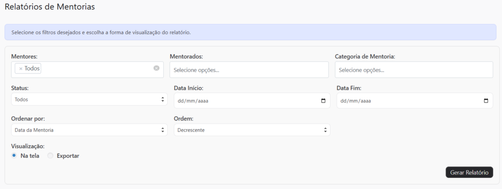 - Mentores: Permite selecionar um ou mais mentores, com a opção de incluir todos.