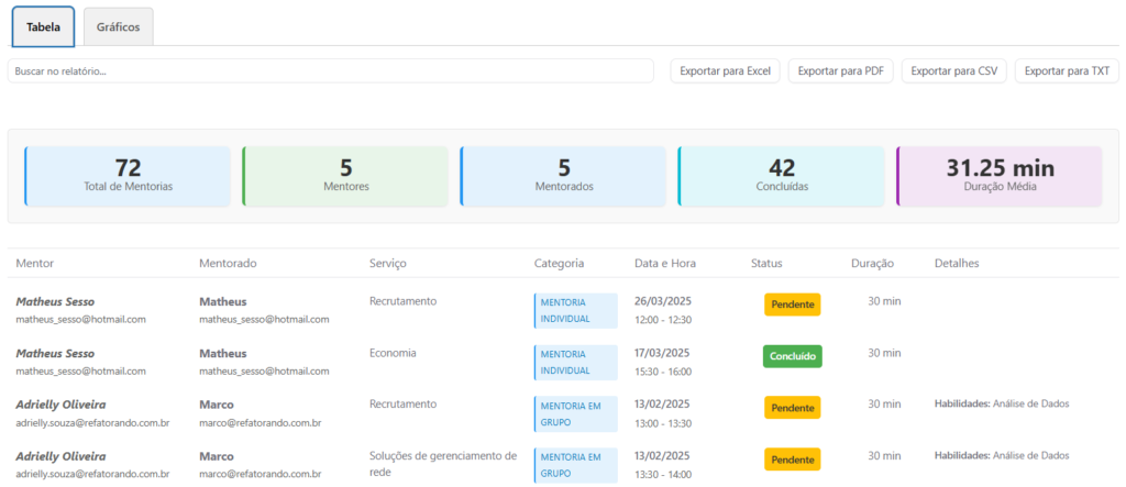 - Apresenta informações como mentor, mentorado, serviço, categoria, data e horário, status e duração.
