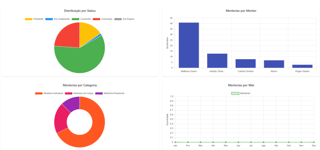 - Distribuição por Status: Gráfico de pizza mostrando a proporção de mentorias pendentes, concluídas, canceladas, etc.