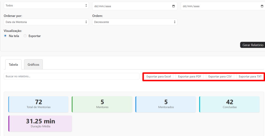 A tela exibida a seguir pertence a um sistema de Relatórios de Mentorias, onde o usuário pode visualizar e exportar informações sobre sessões de mentoria realizadas.