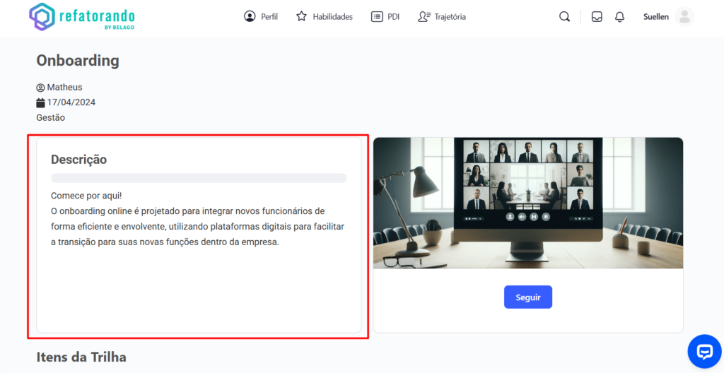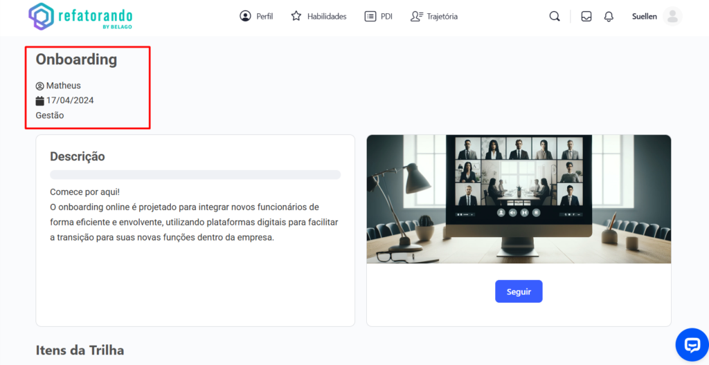 Seguir a trilha: Ao clicar no botão “Seguir”, o usuário pode começar a acompanhar o curso, adicionando-o à sua lista de trilhas seguidas.