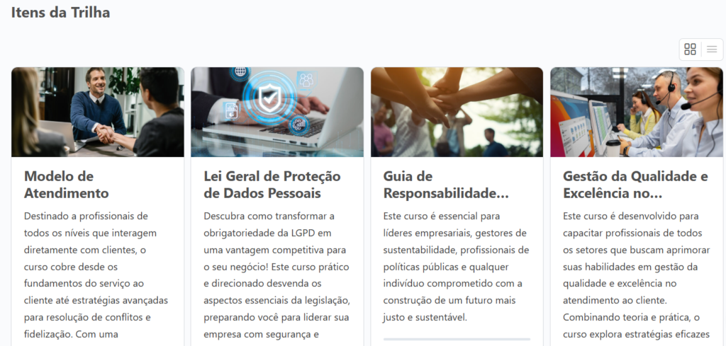 • No canto superior direito da tela de itens da trilha, há um ícone de alternância entre modos de exibição (grade e lista), permitindo que o usuário escolha a forma como deseja visualizar os cursos.